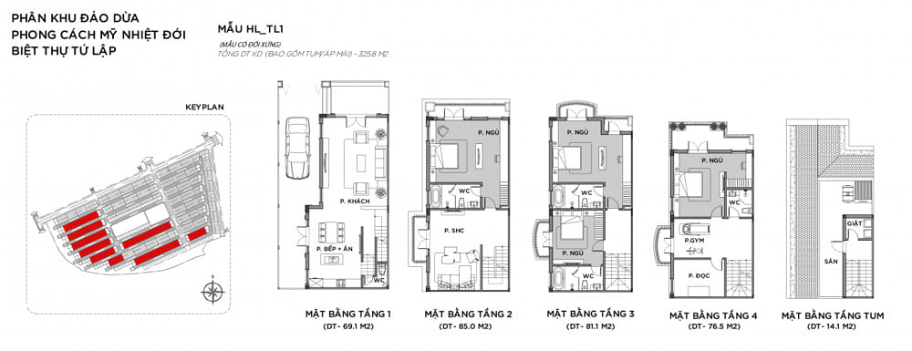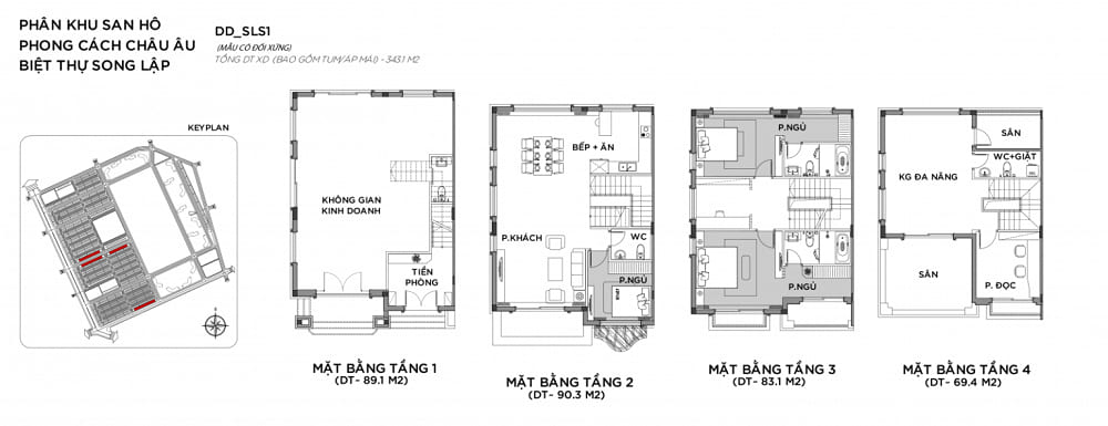 - Biệt thự: Chiều cao 4 tầng với diện tích từ 270 - 343m2, có gara để ô riêng cho các gia đình. Các phòng chức năng được bố trí hợp lý, có khu sân vườn và ban công rộng tạo cảnh quan đẹp mắt.