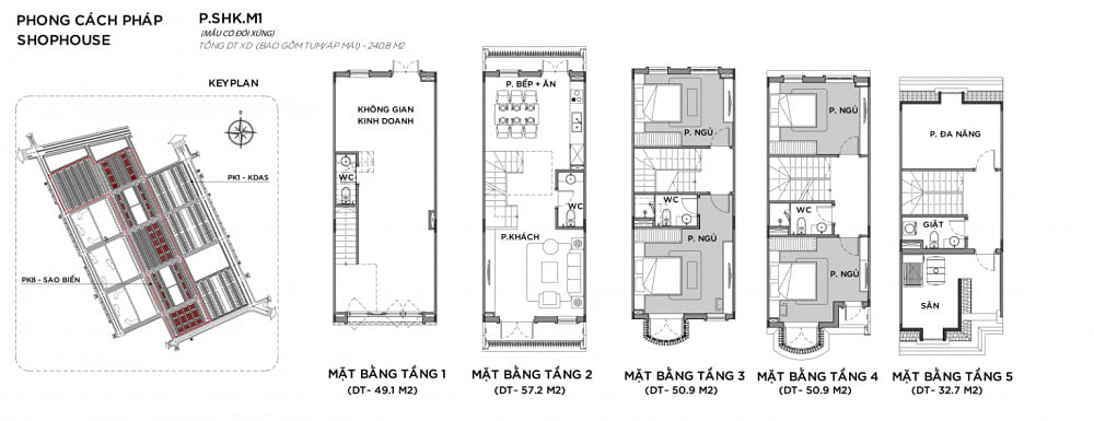 - Shophouse: Chiều cao 5 tầng với diện tích từ 120m2, tầng 1 được bố trí làm không gian kinh doanh với diện tích rộng, tầng 2 là khu vực phòng khách và bếp ăn có thể cải tạo làm nơi kinh doanh nếu cần. 3 tầng phía trên bố trí các phòng ngủ và sân phơi.
